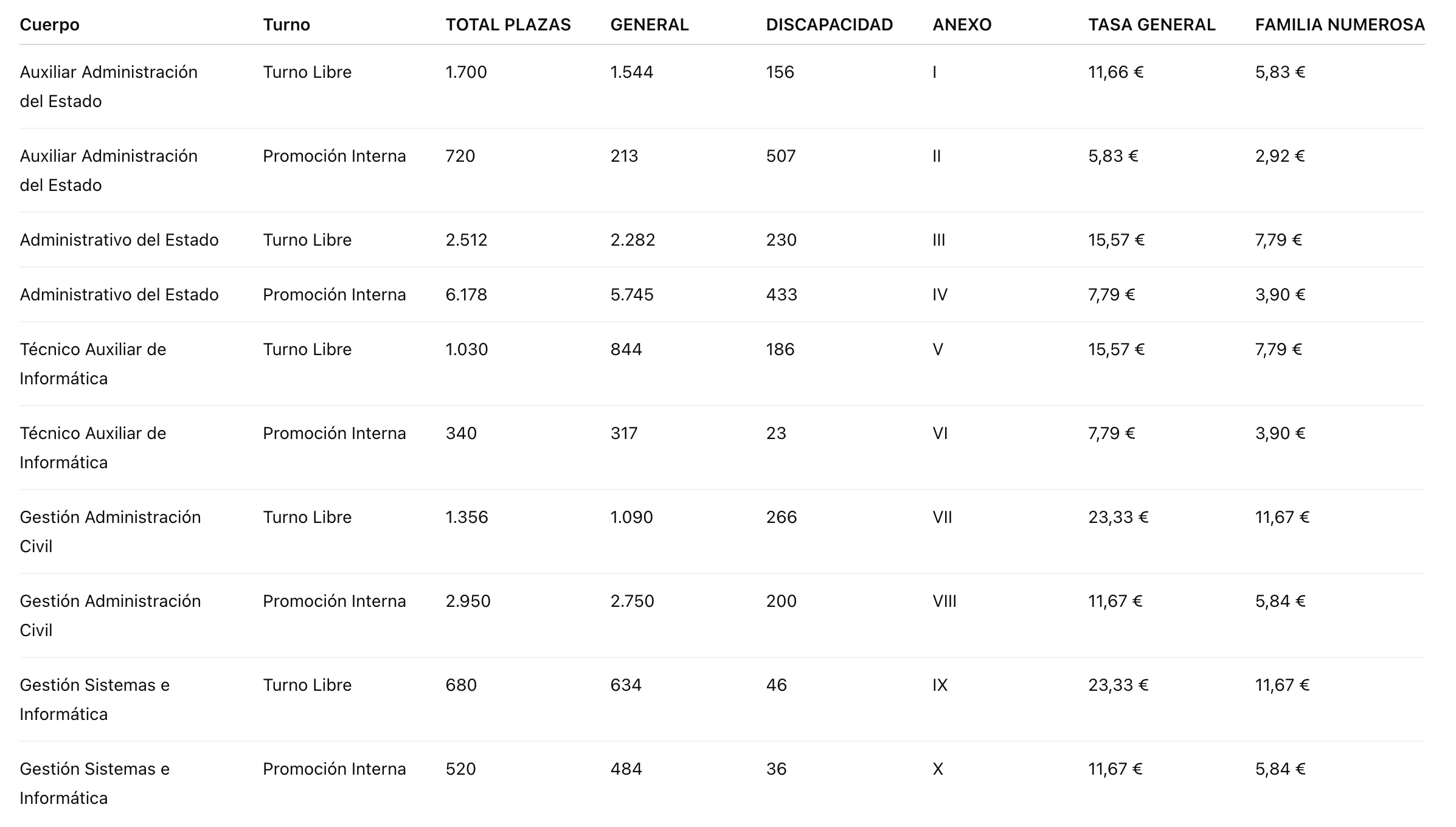 | Cuerpo funcionario | General | Discapacidad | Total de las plazas |